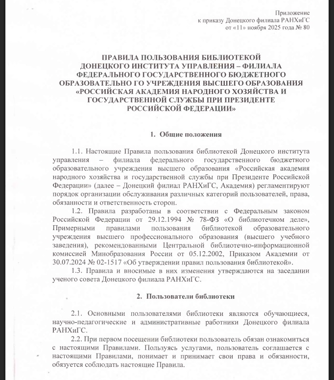 Деятельность библиотеки регламентируется локальным нормативным актом «Положение о библиотеке Донецкого филиала РАНХиГС».
